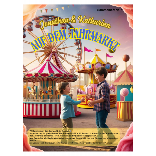 In „Jonathan & Katharina auf dem Jahrmarkt“ erleben Kinder eine liebevoll gestaltete Reise durch 30 fantasievolle Geschichten – vom fliegenden Teppich über die Zuckerwatte mit Zaubergeschmack bis zur Gondelfahrt ins Abendrot. Jedes Kapitel ist eine in sich geschlossene Vorlesegeschichte, die durch ein passendes Ausmalbild ergänzt wird – zum Träumen, Entdecken und Kreativsein.